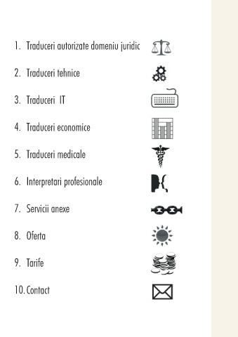 1. Traduceri autorizate domeniu juridic 2. Traduceri tehnice 3. Traduceri IT 4. Traduceri economice 5. Traduceri medicale 6. Interpretari profesionale 7. Servicii anexe 8. Oferta 9. Tarife 10. Contact