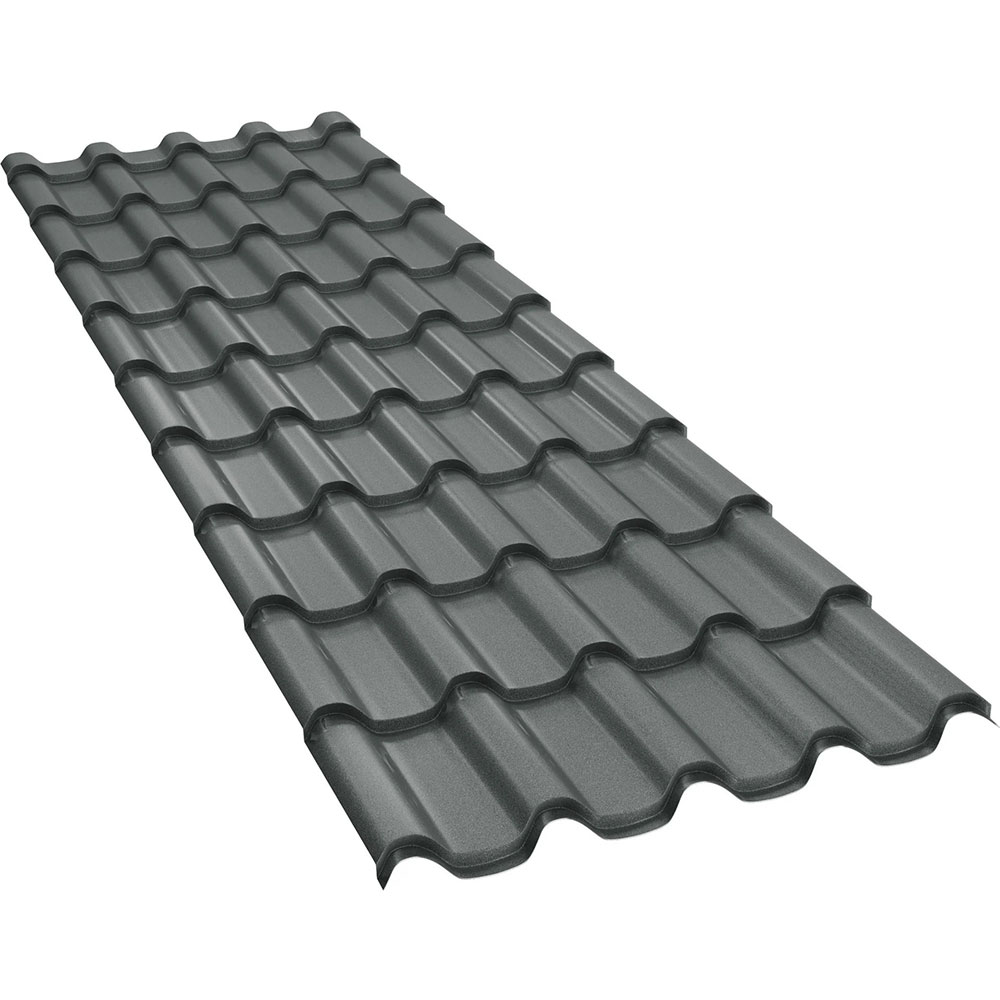 Tigla metalica BILKA model Romanic, finisaj Mat, culoare Gri Grafit (RAL 7024) este profilată este profilată din oțel de grosime de 0,50 mm, zincat (Z225-Z275).
